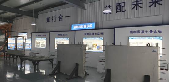 装配式建筑一体化实训基地占地面积约670㎡,具有实操安全、简单易学特点,实现了“教、学、训、练、考”一体化的教学目标,是全面认知装配式建筑的实训基地。该基地主要包含历史文化体验区、预制构件展示区、模拟生产体验区、模拟施工体验区、深化设计体验区五大功能分区,主要应用于装配式建筑专业学生认知学习与实操学习。