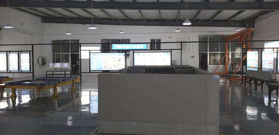 (五)生产工艺实训区:以预制构件生产模台为实操核心,此区域包含四个生产模台,分别展示墙板模具、桁架叠合板模具拼装及配套钢筋,模台尺寸为3500mm*2000mm,在展示典型装配式建筑预制构件的生产工艺同时,学生上课可在模台上动手进行摆模拼模、钢筋绑扎、预埋件摆放等关键生产技术,可作为“预埋工”的实操考核区域。