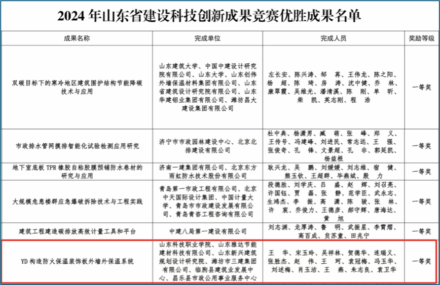 10月27日,由山东省住房和城乡建设厅主办的2024 年山东省建设科技创新成果竞赛在济南举行,全省共 199 项科技创新成果入围答辩、评审,我校与山东雅达节能建材科技有限公司、山东新兴建筑规划设计研究院等单位联合申报的《YD构造防火保温装饰板外墙外保温系统》荣获科技创新成果一等奖,betway88西汉姆联王华老师、宋玉玲老师主持参与项目并进行答辩。